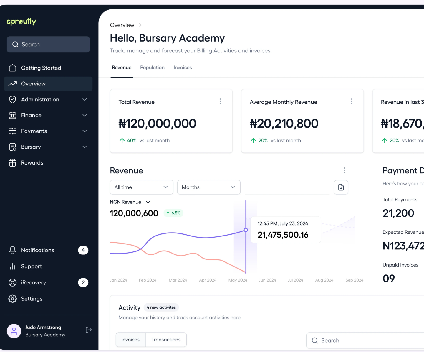 NexusNova developed a seamless, AI-powered financial management platform tailored for schools. By automating transactions, improving reporting accuracy, and ensuring regulatory compliance, Sproutly empowered schools with the tools to maintain a steady monthly revenue stream and enhance financial decision-making.